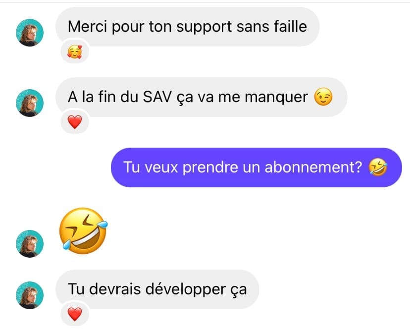 Oui tout à fait ! Si lorsqu'on arrive à la fin de la prestation, tu souhaites rajouter 1 mois de SAV supplémentaire avec la visio de 1h incluse, il suffit d'en faire la demande et sera facturé 100€.
